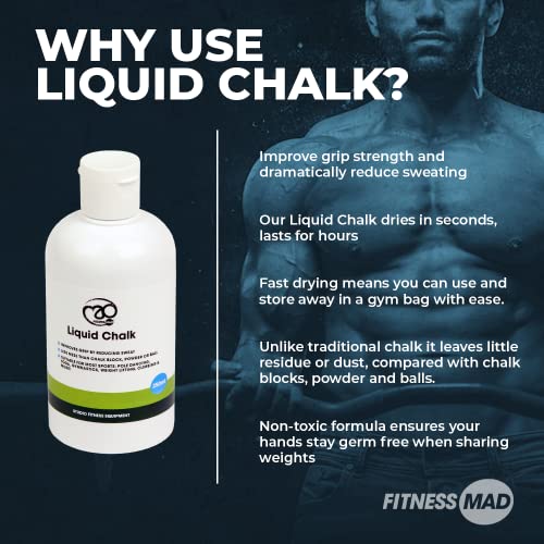 Specification: Fitness Mad VLOEIBARE CHALK, extra sterkte en zweetvrije hand, krijt voor klimmen, gewichtheffen en crossfit, gemaakt in…