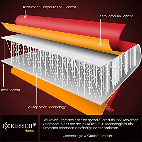 Duurzaam en slijtvast: in de KESSER-turnmat zijn speciale lagen van pvc-zeildoek verwerkt. Dankzij de V-Drop stitch-technologie is de yogamat bijzonder duurzaam en slijtvast. De robuuste tumblingmat bestaat uit pvc-weefsel en behoudt de vorm en stabiliteit bij druk en stoten.