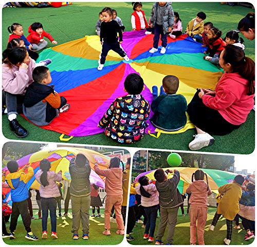 Roterende Rainbow Play parachute 12 voet met 12 aparte handgrepen, die gelijkmatig verdeeld zijn, voor samenwerkingsgroepsspel. Ideaal voor de ontwikkeling van waarnemings-, cognitieve, motorische en academische vaardigheden. Ideaal voor verjaardagsfeesten of familiefeesten. Hoogwaardig, duurzaam 190T polyester taftweefsel met versterkte handgrepen. Inclusief opbergzak.