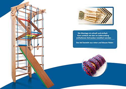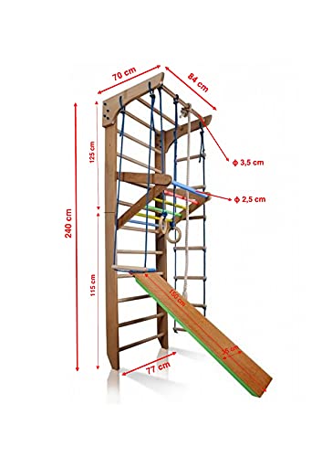 Technische informatie: Materiaal; rek – beukenhout, zijkanten – dennenhout Onderdelen: Zweedse ladder, vaste stang, touw, schommel, ringen, touwladder, afneembare kinderstang, glijbaan Afmetingen; hoogte 240 cm, lengte 84, breedte 70 cm, glijbaan 150*35 cm; gewicht 36 kg De zijkanten bestaan uit twee delen De maximaal mogelijke belasting van de ladder is tot 160 kg, bovenste stang tot 100 kg, hangende elementen tot 60 kg Alleen voor gebruik binnenshuis De touwen zijn blauw en rood Bestemd voor kinderen vanaf 2 jaar. Inclusief handleiding en montage set